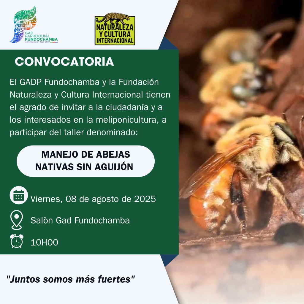 El GAD Parroquial de Fundochamba, en coordinación con la Fundación Naturaleza y Cultura Internacional Ecuador invitan cordialmente a nuestros productores y a toda la comunidad al Taller sobre el manejo de abejas nativas sin aguijón.