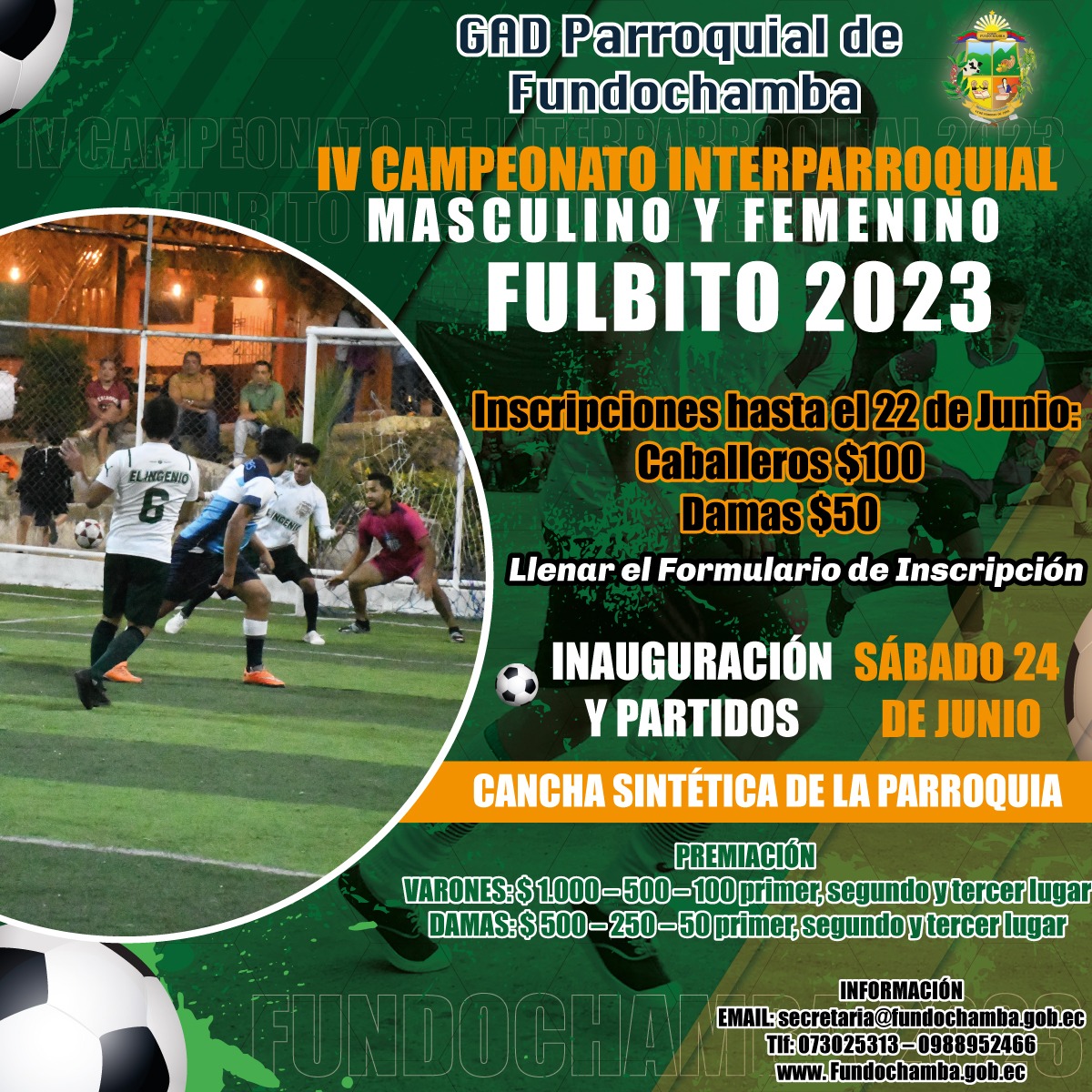 El GAD Parroquial de Fundochamba invita al IV Campeonato Interparroquial Masculino y Femenenino Fulbito 2023.